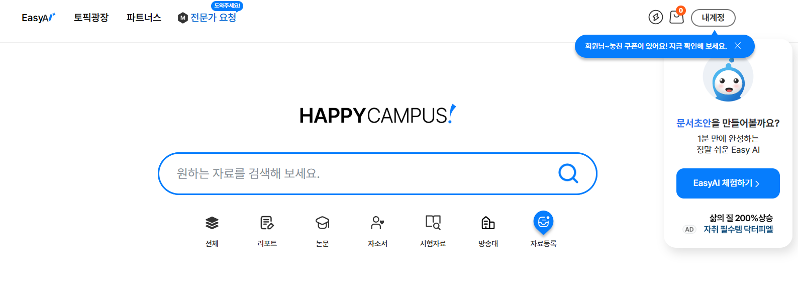 해피캠퍼스에서 대학레포트, 방송대(방통대), 자소서, 시험자료를 빠르게 찾아보세요!